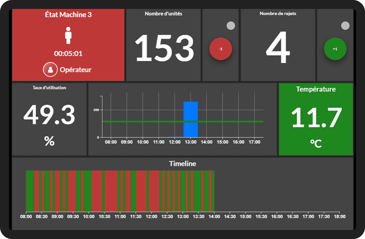 Les tableaux de bord sont entièrement personnalisables, vous permettant de choisir les indicateurs et les graphiques qui correspondent le mieux à vos besoins et à ceux de votre entreprise. Vous pouvez ainsi visualiser les données de performance de vos machines manufacturières de manière claire et concise.